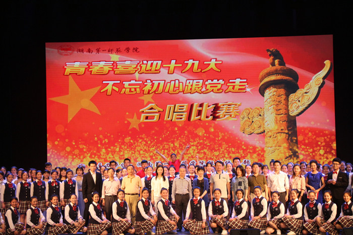 为迎接党的十九大胜利召开,弘扬爱国主义精神,丰富校园文化生活,展示我校红色教育与师范生素质教育齐头并进的丰硕成果,6月6日晚,我校在音乐剧场举行了“青春喜迎十九大,不忘初心跟党走”主题合唱比赛。本次比赛由校组织统战部和团委联合主办,校党委书记彭小奇、校长童小娇以及相关部门负责人和1000余名学生共同观看了比赛。校党委委员、党政办主任任晓晴、监察处处长莫崇芬、机关党总支书记魏全顺、工会常务副主席陆军、音乐舞蹈学院党总支部书记谭顺来担任本次活动的评委。