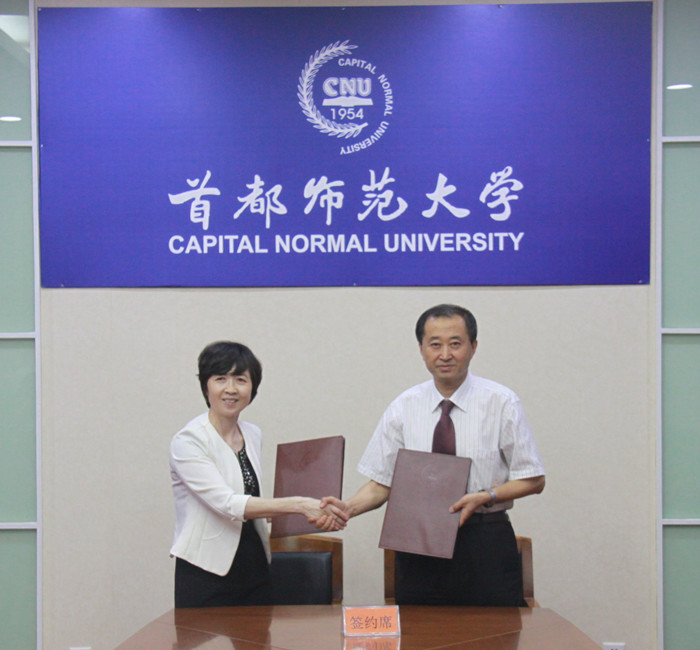 5月26日上午,我校与首都师范大学友好合作备忘录签字仪式在首都师范大学国际文化大厦第九会议室举行。我校校长童小娇、副校长刘鸿翔,首都师范大学校长宫辉力、副校长何奕騉出席签字仪式。何奕騉主持仪式。