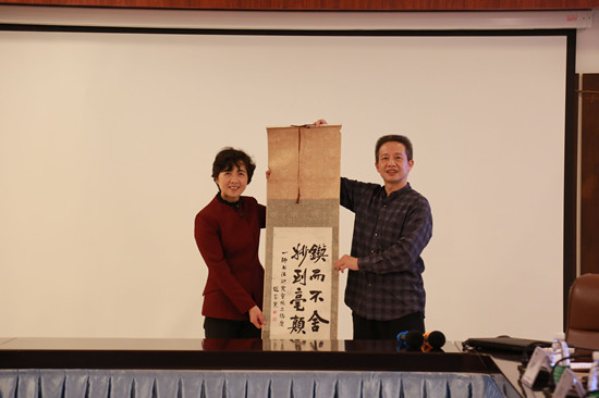 王韦华董事长是我校优秀校友,在交流会上他向我校赠送了他珍藏了30多年的,在我校求学时著名教育家、书法家赵家寰为一师书法研究社成立书写的一幅书法作品,表达了对母校的深厚感情。