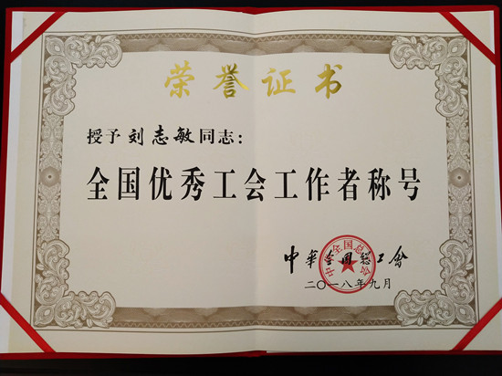 校党委副书记、工会主席刘志敏荣获“全国优秀工会工作者”称号