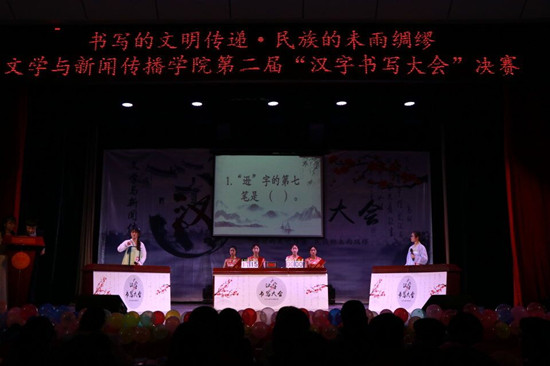 12月4日晚,文学与新闻传播学院第二届汉字书写大会决赛在特立楼实验剧场隆重举行,学生工作部部长陈志武、文传院党政负责人、学工办全体教师及数百名学生观看了此次比赛。语言学教研室胡孜娴老师和周媛老师担任评委。