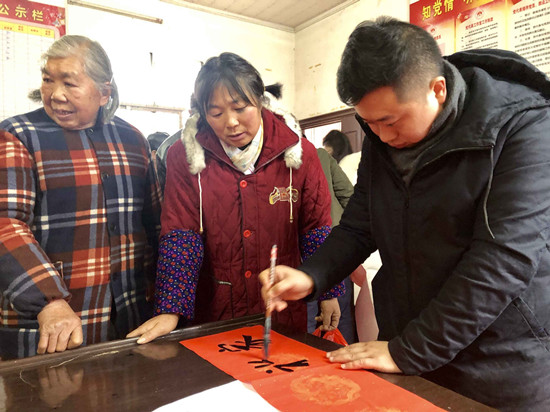 1月14日,在农历新年即将来临之际,校纪委书记李昱率美术与设计学院院长范迎春、党总支书记苏美华及书法专业师生一行14人来到我校驻点扶贫村——双峰县长丰村,为当地群众现场挥毫泼墨送春联、送新春祝福。校党委委员、宣传部长、长丰村党支部第一书记赵小群,扶贫工作队员鲁云生、李豪杰参加活动。