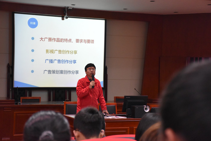 李正良教授首先对大广赛作品的特点、要求和要领做了详细的分析讲解,然后结合具体案例,分享了自己在影视广告创作、广播广告创作和广告策划案创作等方面的实践经验和研究成果。讲座中,李教授穿插放映了往届大广赛的部分优秀作品,并邀请师生发表自己的看法。在提问环节,在座师生就大广赛的参赛规则和评选标准等方面进行了提问,李正良教授一一作出详细解答。最后,李正良教授用“获奖非难事,参与即成功”这句话鼓励我校学生积极参与大广赛。