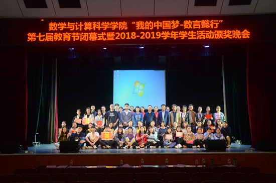 5月6日晚,数学与计算科学学院“我的中国梦·数言懿行”第七届教育节闭幕式暨2018-2019学年学生活动颁奖晚会在实验剧场举行。学生工作处副处长吴涛、东塘社区党总支书记蒋科及社区志愿活动负责人陈宇翔、学院全体负责人出席本次活动并担任颁奖嘉宾,学院300余名学生及部分教师参加了此次活动。