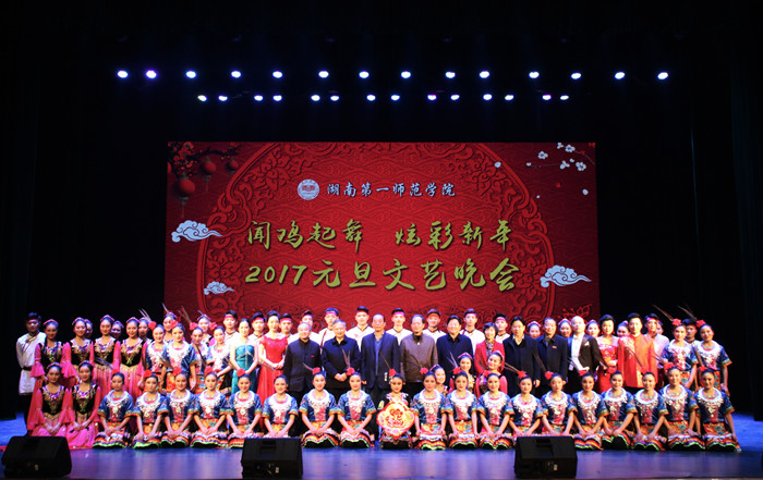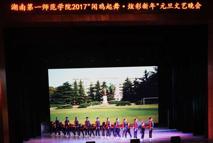 晚会开始前,舞台背景墙播放了2016年学校十大新闻宣传片。短片回顾和总结了一年来学校的重大新闻事件,展示了学校本年度在各个方面取得的可喜成绩:2016年,是扬帆启航的一年,学校第一次党代会胜利召开,描绘了学校发展的宏伟蓝图;2016年,是充满希望的一年,我校首届六年制免费定向师范生顺利毕业,将为基础教育事业发展奉献自己的青春与热血;2016年,是鼓舞人心的一年,我校研究成果成功入选湖南省智库研究“十大金策”,彰显了与时俱进的“一师智慧”;2016年,是满载收获的一年,我校顺利通过本科教学水平评估,人才培养质量和办学水平得到广泛认可。