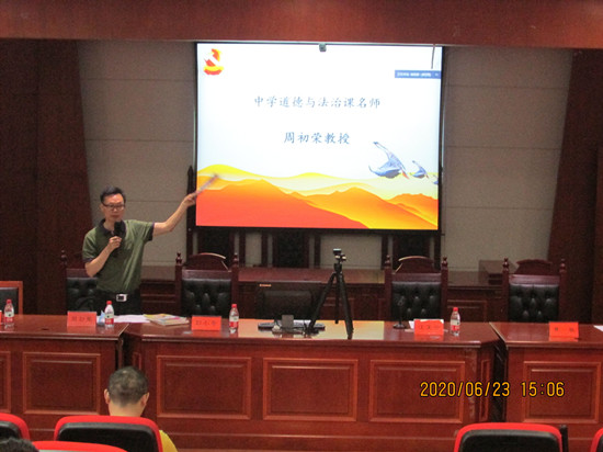 研讨会的三位特邀嘉宾分别作了精彩的演讲。博才寄宿小学黄敏老师从一条主线、六大生活领域、七大教育主题等方面介绍了小学道德与法治课程设计和教材编写的基本思路;周南雨花中学周初荣老师分析了初中学段道德与法治课程的主要教学内容、教学方法以及学情,强调指出了初中道德与法治教师应当具备的综合素养;长沙教育学院唐良平教授通过线上讲座方式深度解读了新课改对高中思想政治学科在课程板块、教学内容等方面所带来的一系列变化。