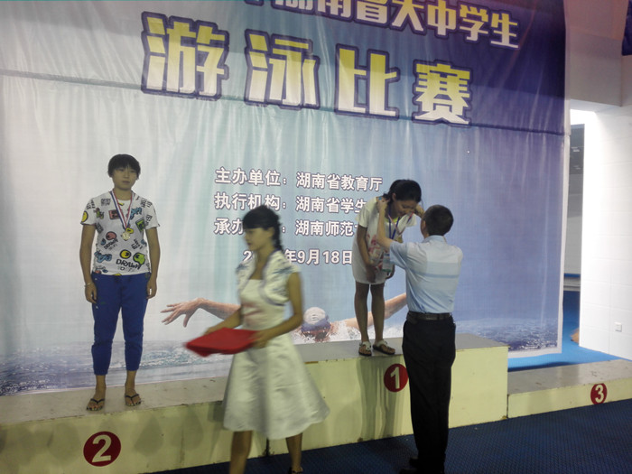 9月20日,2016年湖南省大中学生游泳比赛在湖南师范大学落幕。我校首次报名参加此项比赛,在教练员唐智鹏老师的指导下,我校数计院学生谢璐全力拼搏,在50米蛙泳、100米蛙泳两个项目上,游出自己历史最好成绩,斩获1金1银,实现我校升格以来在游泳项目上零的突破,为学校争得了荣誉。