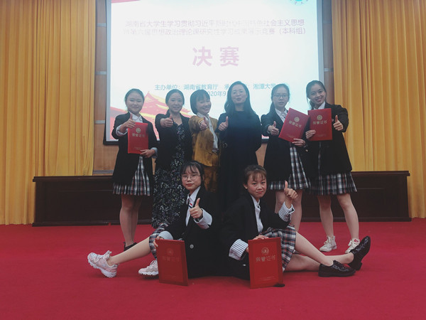 9月26日,湖南省大学生学习贯彻习近平新时代中国特色社会主义思想暨第六届大学生思想政治理论课研究性学习成果展示竞赛决赛(本科组)在湘潭大学举行。我校外国语学院2019级英语一班学习小组成员罗琦、邓莞莹、曾海玲、周艺萌、尹琛鑫五名同学在马克思主义学院老师向婷、谭彩霞指导下,以《用抗疫精神涵养新时代青年的家国情怀》为主题,荣获本科组一等奖(共三名)。