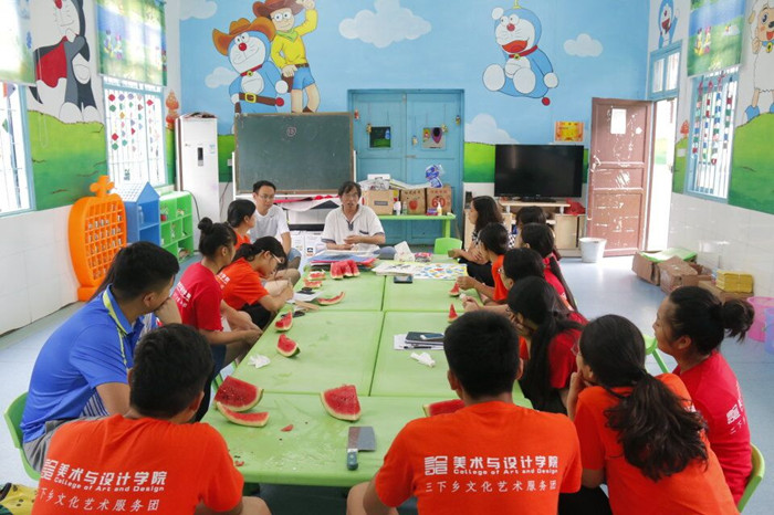 本次活动得到了美术与设计学院院长范迎春教授的大力支持和方法上的引领。17日,时值酷暑之际,范院长带领美术与设计学院全体领导和部分老师来到了山江镇完小视察,大家认真地观看了小朋友的作品汇报展,饶有兴趣地听取了志愿者们的汇报,并对本次活动进行了充分的肯定和鼓励。