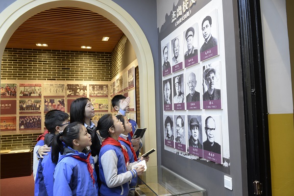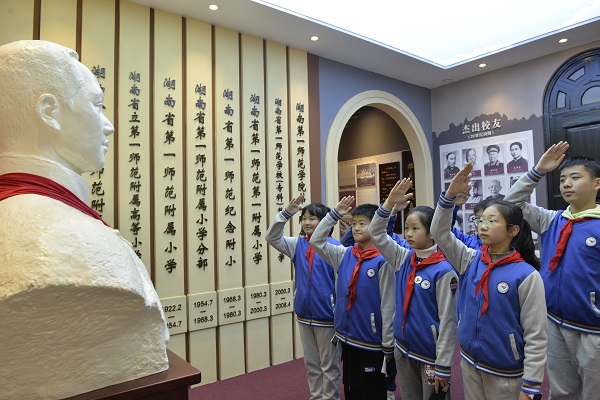 在清明到来之际,孩子们更加不会忘记在学校群星璀璨的光辉历史中,那一位位名字响彻云霄的先辈——曾任教于此的老一辈革命家毛泽东、何叔衡、李维汉、谢觉哉、萧三,杰出校友任弼时、毛泽覃、陶峙岳、廖沫沙。少先队员代表们走进校史馆,深切缅怀为党的革命事业做出巨大贡献的杰出师生。一张张陈旧照片、一件件斑驳文物,队员们或是驻足观望,或是凝神思考,学习着那一段段跌宕起伏的峥嵘岁月中先辈们坚守信仰、发奋图强的英雄故事。