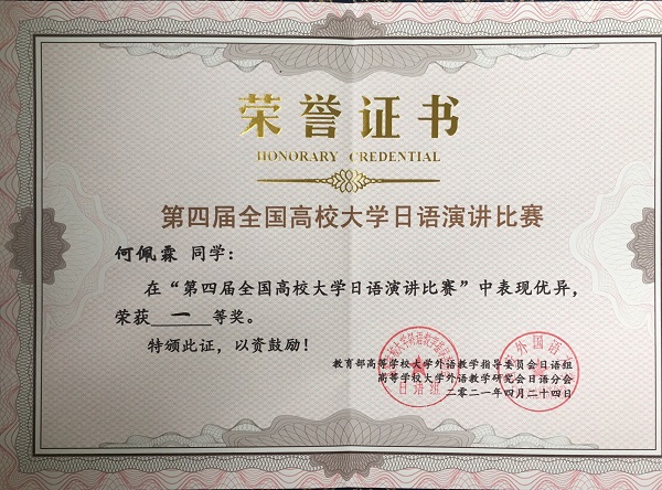 在刚刚揭晓的第四届全国高校大学日语演讲比赛中,我校外国语学院18级英语4班何佩霖同学以命题演讲第一名,总分第二名的好成绩荣获全国一等奖, 指导老师刘锐、吴娱获得优秀指导老师奖。这是我校选手在该项赛事上获得的历史最好成绩,此前已连续三年获得全国二等奖的成绩。