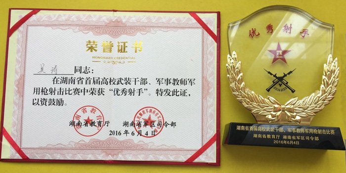 6月4日,由湖南省教育厅、湖南省军区司令部联合举办,湖南警察学院承办的湖南省首届高校武装干部、军事教师军用枪射击比赛在湖南警察学院射击馆举行,我校代表队荣获团体“一等奖”和一个“优秀射手”奖。