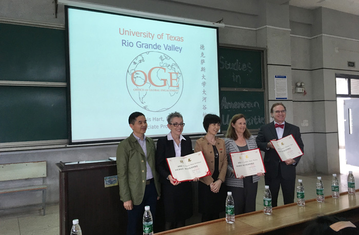 我校校长童小娇与美国德州大学大河谷分校副校长、常务副教务长Dr. Cynthia Jones Brown签订了合作意向书。随后,童小娇校长代表学校向美国德州大学大河谷分校副校长、常务副教务长Dr. Cynthia Jones Brown,副教务长、国际事务处处长Dr. Dennis Michael Hart,教育学院院长Dr.Patricia Maria McHatton颁发了客座教授聘书。