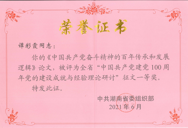 2021年是中国共产党成立100周年。为了认真回顾、深刻总结建党100年来党的建设的历史进程,省委组织部、省委党史研究院、省党建研究会联合在全省组织开展了“中国共产党建党100周年党的建设成就与经验理论研讨”征文活动,形成了一批质量较高的成果,经认真评审,共评出一等奖5篇、二等奖15篇、三等奖27篇。我校马克思主义学院教师谭彩霞的论文《中国共产党奋斗精神的百年传承和发展逻辑》荣获一等奖,并在会上做主题发言。