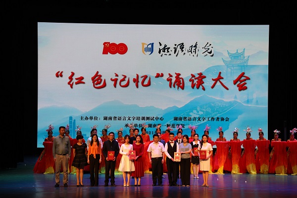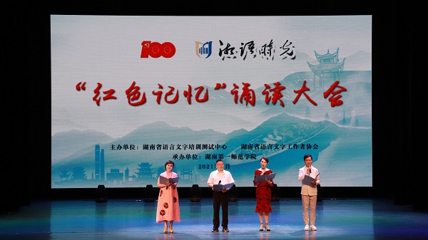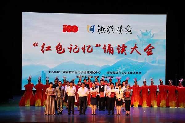 忆往昔峥嵘岁月,看今朝神州光辉。6月29日,“湘语时光•红色记忆”2021年度诵读大会在我校东方红校区田汉剧场成功举办。校党委书记罗成翼、校长童小娇、副校长周发明、江正云、蒋蓉,省语言文字培训测试中心主任冯传书、副主任鄢明芳、白昕,湖南省语言文字工作者协会常务副会长高广安、湖南省语言文字工作者协会副会长胡承教,常德市教育局副局长苏宏元,相关高校和测试站的领导出席活动,我校师生代表600余人,欢聚一堂,共享语言盛宴。