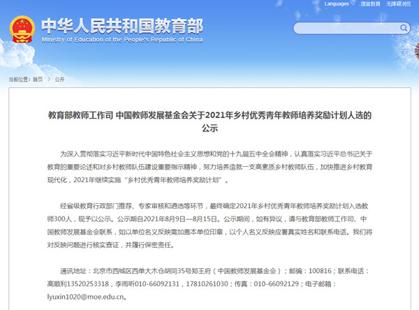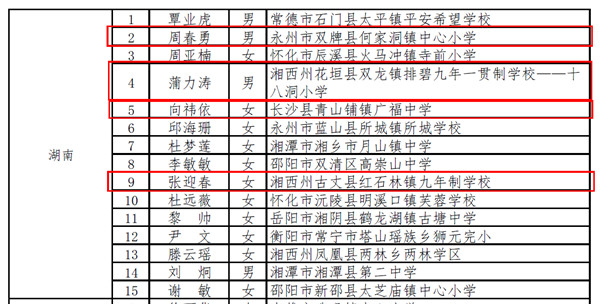 日前,经省级教育行政部门推荐、专家审核和遴选、教育部官网公示等环节,教育部教师工作司、中国教师发展基金会最终确定300人入选2021年乡村优秀青年教师培养奖励计划,湖南省有15名教师入选,其中我校有周春勇、蒲力涛、向祎依、张迎春4名毕业生入选。