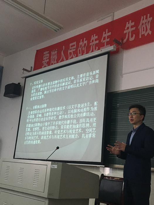 4月27日上午,《人民音乐》编辑部主任张萌博士应邀来我校做了一场题为“动机与展开——音乐论文写作中的几个核心问题”的讲座。讲座由曹兴副校长主持。科研处负责人、音乐舞蹈学院部分师生聆听了本次讲座。