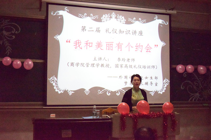 为强化同学们的礼仪观念,培育当代大学生青春健康、积极向上的精神风貌,5月4日晚,外国语学院邀请我校商学院教授、国家高级礼仪师李玲老师为全院学生做了题为“我和美丽有个约会”的礼仪知识讲座。