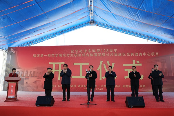 我校全体校领导、师生代表,湖南湘江新区、长沙高新区领导以及体育馆项目各参建单位代表参加了仪式。仪式中,我校学生朗诵了毛主席诗词《沁园春·长沙》,向毛主席诞辰128周年献礼。
