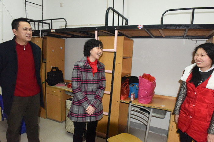 下午3:00,童小娇、刘宇一行径直前往学生公寓看望到校学生。童小娇深入学生寝室,详心询问同学们过年的感受、新年的愿望,勉励同学们尽快调整心态,恢复平时的学习、生活节奏,争取新年更大的进步。童小娇、刘宇一行还仔细查看了公寓过道的消防设施、寝室门窗,询问了同学们生活热水使用情况,对存在的问题,童小娇、刘宇叮嘱相关部门负责人尽快派人处理,绝不能给学生的生活、学习带来不便。在学生三食堂,童小娇向食堂承租人详细询问了开餐准备情况,叮嘱食堂负责人千万要注意食品安全、饮食安全,并建议适时在学生中开展调研与满意度测评,广泛征集同学们的意见,根据学生的饮食习惯需求调整食品结构,确保学生饮食营养可口、安全放心。与此同时,校党委委员、团委书记任晓晴带队对东方红校区教学区的环境卫生、教室设备等准备情况进行了全面检查。