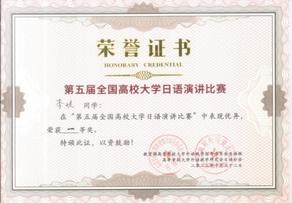 10月22日,第五届全国高校大学日语演讲比赛落下帷幕,我校外国语学院19翻译1班李妮同学在吴娱、刘锐两位老师的精心指导下荣获一等奖。