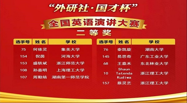 “外研社·国才杯”全国英语演讲、写作、阅读大赛已连续五年入选教育部中国高等教育学会发布的“全国普通高校大学生竞赛榜单”,也是入选该榜的唯一外语类赛事。我校学子连续两年进入全国阅读决赛并获奖。他们与北大、复旦、北外等一流名校学子同台竞技,充分展示出扎实的外语语言基础和良好的精神风貌,也体现出我校外语人才培养的良好成效。