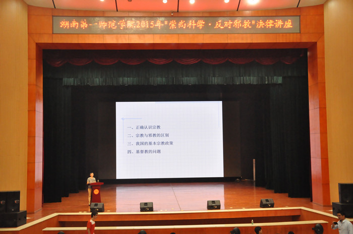 10月24日晚,由保卫处、学生工作处组织的反邪教教育讲座在音乐剧场举行,2015级新生、全体辅导员参加了本次讲座。讲座由马克思主义学院教师陈明博士主讲。