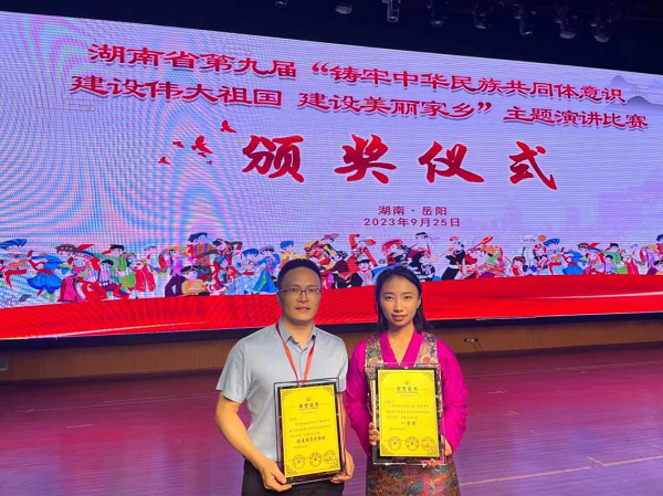 9月25日,湖南省第九届“铸牢中华民族共同体意识建设伟大祖国建设美丽家乡”主题演讲比赛在岳阳市举行,我校初等教育学院21级894班西藏班学生旦增曲珍荣获高校组一等奖,教师李金国获优秀指导老师。