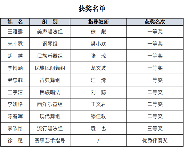 近日,我校在湖南省第十一届本科院校音乐舞蹈专业学生独唱独奏独舞比赛中,荣获5个一等奖、3个二等奖、1个三等奖。一等奖总数居全省高校(本科组)第四名,持续保持在该赛事中第一梯队的高水平。