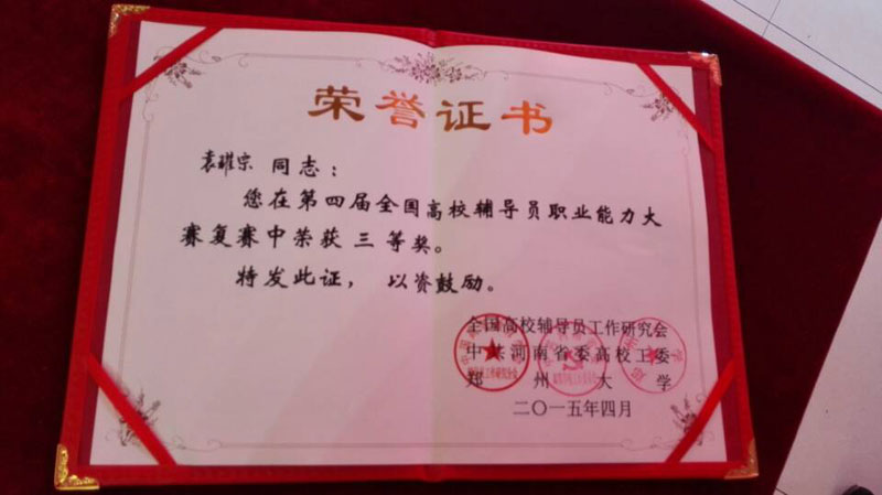 4月24日-25日,第四届全国高校辅导员职业能力大赛第五赛区(含湖北省、湖南省、贵州省、江西省、河南省)复赛在河南省郑州大学成功举办。我校辅导员袁耀宗老师作为湖南省代表团成员之一参加了本次大赛,并荣获三等奖。