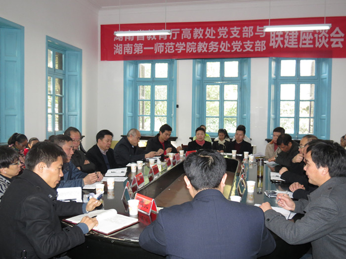 2014年12月31日上午,省教育厅副厅长葛建中,高教处党支部成员唐利斌、杨承玖、张平、张琳、彭玮婧、曾思亮、巩德亮一行8人来到我校城南书院,与我校教务处党支部举行联建座谈会。我校党委书记彭小奇、副校长刘志敏,副校长童小娇,教务处党支部委员以及部分教师代表和学生代表出席了座谈会。座谈会由副校长刘志敏主持。