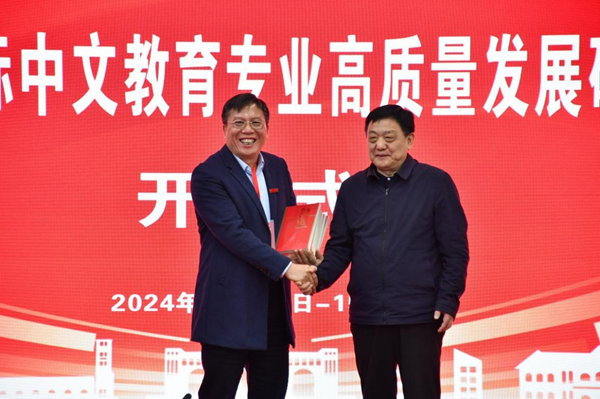 教育部语言文字应用管理司原司长、中国传媒大学姚喜双教授在致辞中提出国际中文教育的“两体三高”,即通过做到“高质量、高技术、高效率”的语言文字研究,为筑牢中华民族共同体和构建人类命运共同体而努力奋斗。开幕式上,姚教授还向我校捐赠了新著《毛泽东诗词赏析与朗诵》,表示将进一步加强与我校的学术交流与合作,把湖南一师的红色资源运用好。