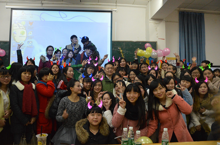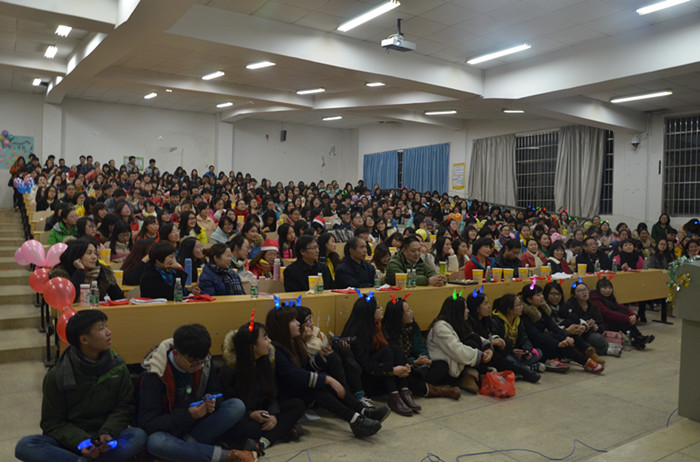 中场抽奖环节,同学们送上了一份珍贵的礼物给“最有爱的肖校长”,该礼物是文学与新闻传播学院学生精心拍摄的一部校领导参与学生活动的短片,以及一个写满学生大爱的留言簿。肖湘愚校长用流利的英文给学生送上了圣诞节祝福和新年祝福。全场学生欢呼雀跃,大声喊出了自己的心声“肖大大,我们爱您!”。