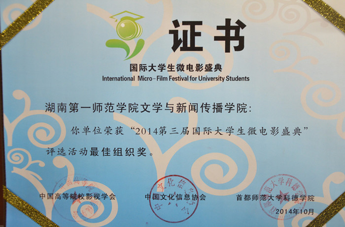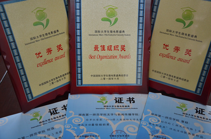 据悉,此次盛典共征集到来自10个国家和地区的作品1500余部,其中包括美国、法国、韩国等国家的微电影作品,竞争十分激烈。我校文学与新闻传播学院由谢杰和朱晶老师指导学生自拍自导自演的DV短剧《微笑的价格》 、《等待》两部作品获得大赛优秀奖,文学与新闻传播学院获得大赛“最佳组织奖”。