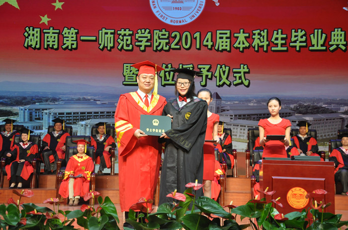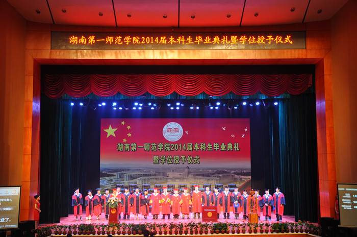 本次典礼分四场进行。第一场举行的是文学与新闻传播学院、美术与设计学院、体育学院,由校纪委书记阳柏苏教授主持,权杖教授为副校长刘志敏;第二场举行的是外国语学院和马克思主义学院,由副校长刘鸿翔教授主持,权杖教授为马克思主义学院院长彭月英;第三场举行的是信息科学与工程学院、教育科学学院,由副校长杨兰英教授主持,权杖教授为科研处处长李勇帆;第四场举行的是数学与计算科学学院、商学院、音乐舞蹈学院,由副校长童小娇教授主持,权杖教授为侯耀平。各学院的教授分别担任相关场次的主礼教授,并在主席台就座。学校相关部门、各学院负责人以及特邀学生家长代表与2014届全体毕业生一同参加了典礼。