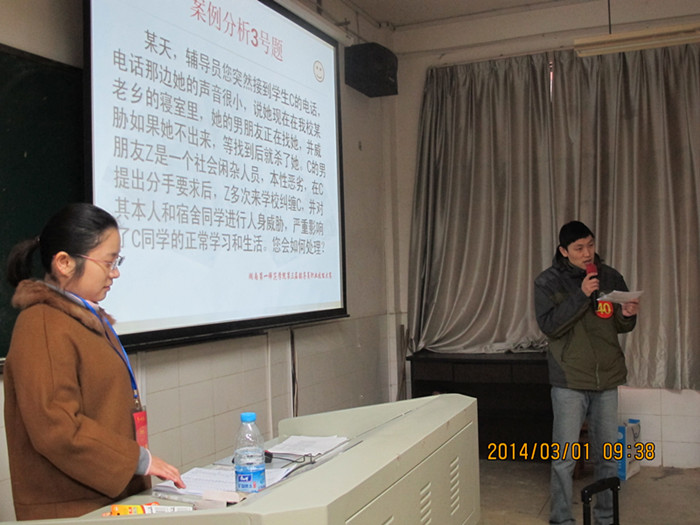 为了深入贯彻落实《中共中央、国务院关于进一步加强和改进大学生思想政治教育的意见》和教育部《普通高等学校辅导员队伍建设规定》(教育部令第24号)精神和湘教工委通[2014]2号文件要求,引领辅导员向职业化、专业化方向发展,3月1日,我校在东方红校区实验楼B栋106教室和206教室举行了第三届辅导员职业技能竞赛初赛。冒着周末严寒恶劣的天气,我校全体在编在岗辅导员精神抖擞、全神贯注参加比赛,各系部党总支书记、副书记担任评委,副校长杨兰英到现场观摩并指导了比赛。