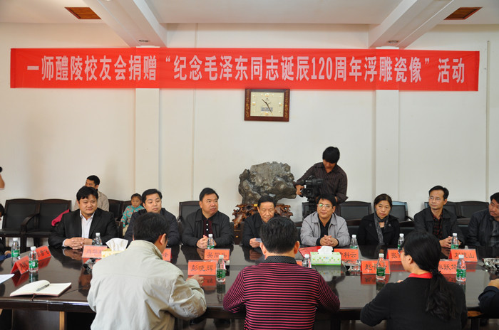 捐赠仪式上,醴陵校友会会长黄科云发表了饱含真情的致辞。他说:母校群星灿烂,名人辈出,深以为傲。一代伟人毛泽东在此求学、工作八个春秋,立下了解放和振兴中华民族之志。历届一师学子沐浴母校师恩,受惠终身。此次捐赠“纪念毛泽东主席诞辰120周年浮雕瓷像”等醴瓷珍品,就是想表达对一代伟人以及母校的怀念与敬仰。