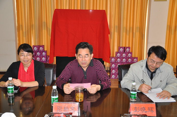 阳柏苏代表学校接受了我校醴陵校友会名誉会长易达成、会长黄科云代表全体醴陵校友向母校捐赠的礼品。这次醴陵校友会捐赠的礼品主要包括大球泥版“纪念毛泽东同志诞辰120周年浮雕瓷像”1件、优质泥版“纪念毛泽东同志诞辰120周年浮雕瓷像”1件、红梅花“毛瓷”胜利杯100件,总计价值46400元。