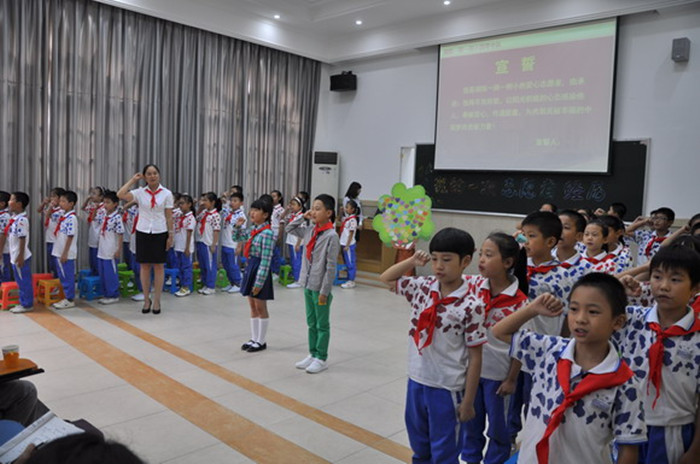 赵雪峰一行首先来到一附小多功能教室,观摩了由四甲中队辅导员喻老师和少先队员们自主设计、精心组织的中队主题队会——“我的一次志愿者经历”。此次队会以“我的一次志愿者经历”为主题,从志愿者的概念引入,由孩子们分享假期中难忘的爱心志愿服务经历。队员们通过看视频、听介绍,展开了热烈的讨论,从而更加深刻地理解了志愿者的精神实质即为“奉献”。紧接着,中队的四支雏鹰小分队以幻灯片的形式分别展现了队员们的志愿经历。最后,全体中队队员们在中队辅导员的带领下,庄重宣誓,表达要努力争做乐于助人、传递正能量的阳光少年,为实现幸福美丽的中国梦而贡献力量的志愿!
