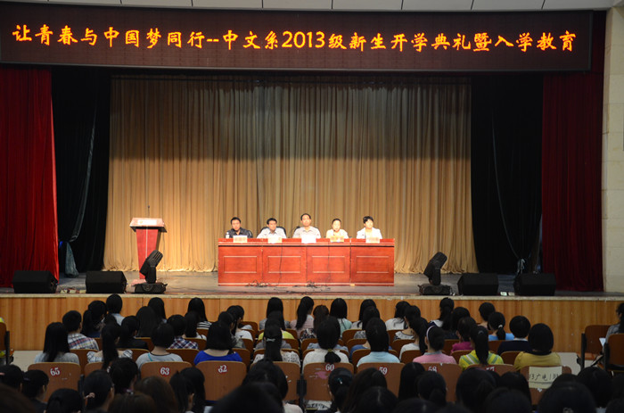 2013年9月8日上午,秋高气爽,硕果飘香,中文系2013级新生开学典礼隆重举行。来自全国各地249名新生怀揣着喜悦与希望,汇聚在科技楼演播厅,正式迎来了他们的大学生涯。