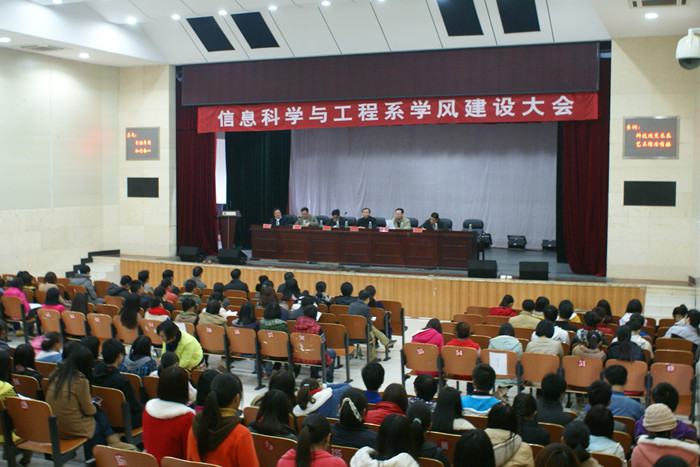11月20日下午,信息科学与工程系学风建设大会在我院东方红校区科技楼演播厅隆重召开。学院副院长刘志敏、学工处副处长丁立平、团委副书记赵小群,信息科学与工程系主任王杰文、党总支书记谢培松、党总支副书记张如健及30余名教师等莅临大会。该系200多名学生参加大会。大会由谢培松主持。