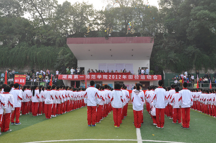 奏国歌仪式后,刘宇副院长致开幕辞,代表学院对运动会的召开表示热烈祝贺。刘宇副院长说,95年前(1917年),毛泽东主席就提出了“野蛮其体魄,文明其精神”、“三育并重”、“身心并完”的教育思想,这种教育思想也深深地融入了我们第一师范的办学理念中。在第一师范的办学初期,以毛泽东等为代表的师生们,就高度重视体育。早在1930年至1933年举行的全省第十至第十三届学生运动会上,一师学生就先后获得了6项田径冠军,10枚游泳金牌,创造了3项全省学生运动会纪录。一九四九年后,学校无论是在中师还是大专阶段,体育工作都取得了骄人成绩。2008年升格为本科院校以后,学校体育工作继续着良好的发展态势,在参加的各项体育比赛中取得了优异的成绩:从2009年至今,我院体育代表队在全国和全省大学生田径、健美操、啦啦操、武术、篮球、排球、乒乓球等运动比赛中,共获得金牌44枚,银牌33枚,铜牌21枚,团体总分多次位居同类院校第一名。一师体育的光辉业绩不仅体现在历史上曾经培育了毛泽东等老一辈杰出校友,而且她所内含的顽强拼搏、奋勇争先的体育精神,经一代代一师人的传承,化作了一师优良的教育传统,哺育了一代又一代一师人的健康成长!本次田径运动会的举行,既是对我院升本以来学校体育工作的大检阅,也是对我院师生精神风貌的大检阅!随着现代社会的高速发展,处处充斥着竞争,学习的压力、就业的压力、生活的压力、工作的压力越来越大,我们既要正视这些压力,又要学会化解,变压力为动力,以一种积极向上、健康的心态投入到学习、生活中。身心健康既是我们教育的目标,也是社会发展的需要。“身体是革命的本钱”,“为祖国健康工作50年”!本次运动会的成功举办,必将进一步推动我院体育工作乃至全院各项事业的蓬勃发展,对同学们的健康成长产生长远的影响!刘宇副院长最后希望全体裁判员、工作人员恪守职责,秉公裁决;希望全体运动员本着“友谊、团结、公平、竞争”的奥林匹克精神,发扬顽强拼搏的优良传统,在赛场上赛出风格,赛出佳绩。