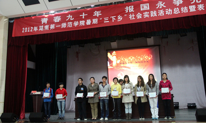会上,全体师生观看了2012年暑期“三下乡”社会实践活动视频资料,直观地感受到全院5个小分队110多名师生深入基层开展社会实践活动的感人场面。任晓晴书记对我院2012年大学生暑期社会实践活动从指导思想、策划与宣传、启动与实施、总结与反思四个方面进行了全面总结。宣读了《关于表彰2012年大学生暑期社会实践活动先进团组织和优秀个人的决定》:数理系团总支、外语系团总支被授予2012年暑期社会实践优秀组织奖;守望支教社、家教协会被授予2012年暑期“三下乡”社会实践优秀团队;教育科学系杨雪晴等92名同学被评为2012年暑期“三下乡”社会实践优秀个人;中文系潘阳等108名同学被评为2012年暑期优秀社会实践者。随后,“三下乡”社会实践优秀团队代表数学系以及优秀个人代表陈永倩同学分别作了典型发言。