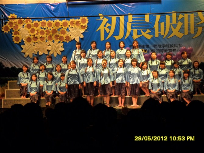 5月29日晚,10级初等教育专业汇报演出“初晨破晓”晚会如期而至,节目精彩纷呈,展现了初等教育专业同学们的青春活力。健美操《水晶炫姿》活力四射;舞蹈《魔爵》展示了魔术的神奇;刘军老师及其朋友献唱的《好兄弟》把整台晚会推向高潮;具有特色的捐赠仪式,把从两个班筹集的书籍、衣服等生活用品捐赠给莲花镇云坪小学的学生,希望借此向大家传递这份爱,一起为有梦想的孩子提供实现梦想的途径。汇演在《每个人都拥有一个梦》的合唱中完满落幕。