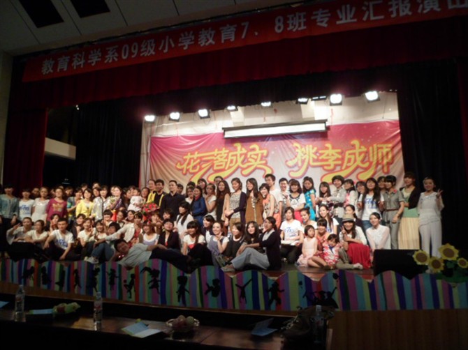 5月24日晚举行的09级小学教育专业7、8班专业汇报演出“花落成实,桃李成师”用极富特色的自拍宣传片和微电影将整场晚会串联起来。晚会在播放富有趣味性的自拍宣传片《注意事项》中拉开序幕。舞台大屏幕上播放了两个班114名同学和三位辅导员老师一路走来的照片剪辑,自创诗歌朗诵和男女对唱《你最珍贵》饱含了对老师的感恩和同窗的友情,也把整场晚会推向了高潮。晚会在记录同学们大学生活的自制视频中画上圆满的句号。