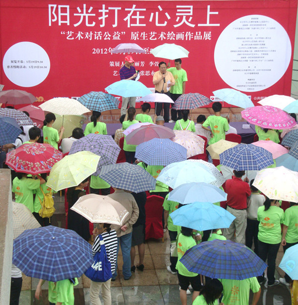 5月19日,阳光打在心灵上——“艺术对话公益”原生艺术绘画作品展在湖南长沙千年时间当代艺术中心开幕。湖南省残疾人联合会副理事长谭奇元宣布画展开幕;湖南省文化交流协会副会长、秘书长马昌忠、长沙市残疾人联合会理事长熊慈明、湖南省美术家协会少儿艺委主任袁江、协盛医院院长董树猛、“蒲公英行动”美术教育专项课题项目主持谢丽芳、芒果画报编辑部主任戴志杰等应邀出席开幕式并先后上台致辞,表达了对展览的美好祝愿以及对社会助残活动的美好期冀。