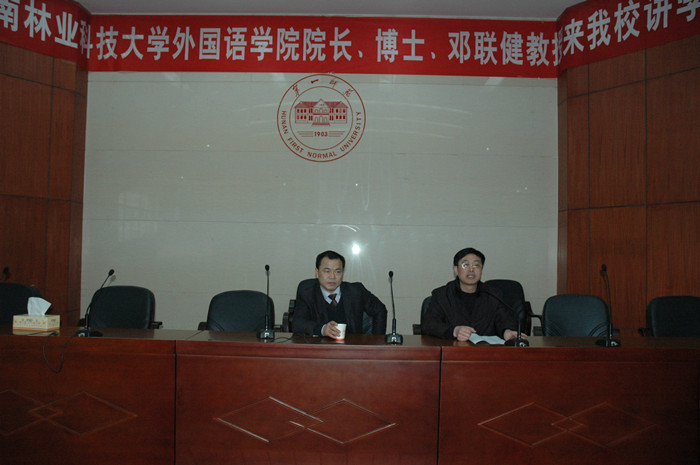 3月15日,中南林业科技大学外国语学院院长、博士、邓联健教授应邀来我院讲学。学术报告会由副院长朱道弘主持。院领导金潇明、刘鸿翔、刘宇和近400名师生在多功能学术报告厅听取了讲座。