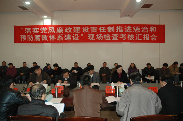 汇报会上,院党委书记詹小平代表学院党委、纪委向检查组汇报了我院“落实党风廉政建设责任制,推进惩治和预防腐败体系建设”的有关情况。詹书记说:我院近几年在党风廉政建设和反腐败工作方面,坚持以毛泽东思想、邓小平理论和“三个代表”重要思想为指导,深入贯彻科学发展观,深刻领会胡锦涛总书记在中纪委历次全会上的重要讲话精神,按照中纪委、省纪委、省教育纪工委关于反腐倡廉建设工作的总体部署,围绕中心,服务大局,坚持“标本兼治、综合治理、惩防并举、注重预防”的方针,认真落实党风廉政建设责任制,有力推进惩治和预防腐败体系建设,为学院全面协调可持续发展提供了有力保证。主要表现在:一是党委行政高度重视,党风廉政建设责任制落实到位;二是教育、制度、监督、惩治并举,惩防腐败体系建设推进有力。詹书记指出:自升本以来,我院上下齐心协力,党风廉政建设和反腐败工作已真正形成和落实了“党委统一领导、党政齐抓共管、纪委组织协调、部门各负其责、群众积极支持和参与”的领导机制和工作机制,反腐倡廉工作取得了显著成效,可以概括为:宣传不断加强,教育更加深入;意识不断强化,推进更加有力;制度不断完善,执行更加规范;监督不断强化,运行更加透明;党风不断清正,廉政更加见效;地位不断提高,工作更加到位。最后,詹书记强调说:反腐倡廉建设是一项长期的、艰巨的、复杂的、关系改革发展稳定的重大工作,我院将发扬成绩、克服不足,特别是要利用这次检查组来我院检查考核的机会,虚心听取意见,认真进行整改,进一步做好我院党风廉政建设和反腐败工作。