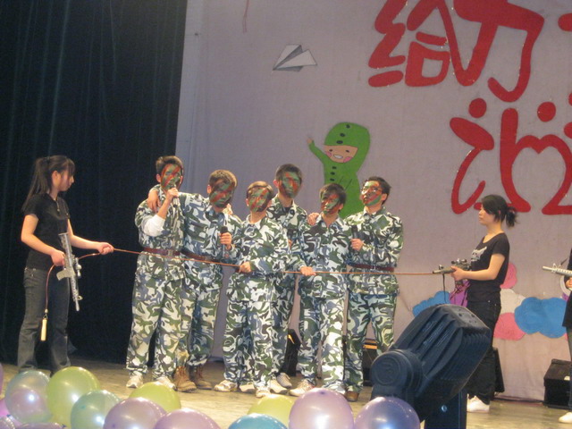 《我是特种兵》取材于去年央视热播电视剧,再现了当代人民解放军英勇抗敌,不怕牺牲,忠于祖国的英雄气概,让现场的学生无不受之鼓舞。《垓下之围》则以蒙太奇的手法,展现了项羽在乌江边上重振雄风,厚积薄发的恢弘气势,立意深远,发人深思。《十全大补汤》再现了经济飞速发展导致的日益严重的环境污染问题,警醒人们保护环境刻不容缓。《新版灰姑娘》中两位俊俏少男着一身连衣裙装,极具幽默的动作造型,出色的表演,逗乐了在场所有观众,将现场气氛推向了高潮。而《荆轲刺秦王前传》,清一色的女子,扮相却个个如矫健男儿,丝毫不输气势,令观众叹为观止。