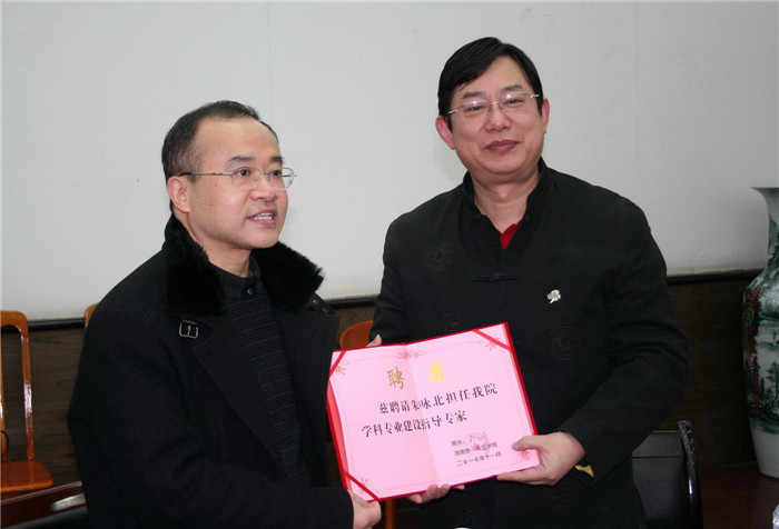 3月8日上午, 著名音乐教育家、博士生导师、湖南师范大学音乐学院院长朱咏北教授受聘为我院音乐系专业学科建设指导专家。党委副书记肖湘愚主持了授聘仪式,院长彭小奇为朱咏北教授颁发了“学科专业建设指导专家”聘书。